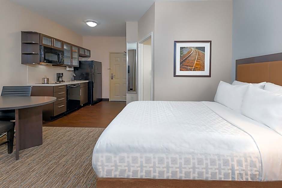 1 King Studio Suite Studio Full Kitchen is 355 square feet and includes a king-size bed 150-183 width plus desk and cable tv.